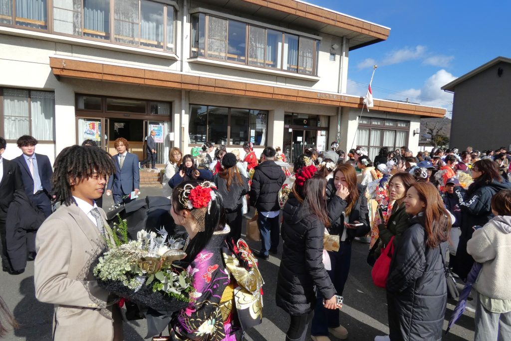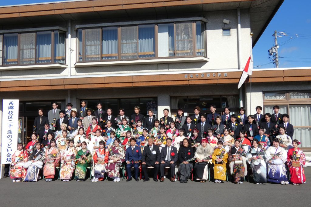 令和8年1月11日(日)、西郷公民館において、自治会連合会主催の「二十歳のつどい」式典が挙行されました。式には二十歳になった65名が参加され、来賓としてご臨席いただいた恩師の先生や、久しぶりに会った級友たちと懐かしそうに笑顔で語り合いました。今年度より、10年前の小学4年生時の「1/2成人式」で書いた「将来の自分への手紙」が渡され、皆さん大事そうに受け取られました。担任の先生の粋な計らいで「読んでくれる子、手を挙げて」…一人の青年が手を挙げ、当時一番好きだった彼女の前で手紙を読んでくれ、会場は割れんばかりの拍手と歓声で大盛り上がり‼ 時折、風雪の混じる悪天候の式でしたが、この1件が効いたのか、外での集合写真を撮影する頃には青空も祝福し「記念の一枚」が美しく撮れました。この撮影の直後にはまた雪が降りだして「この子たちは持ってるね…」「きっと未来も明るいよね!」とみんながそう思う素晴らしい「二十歳のつどい」でした。